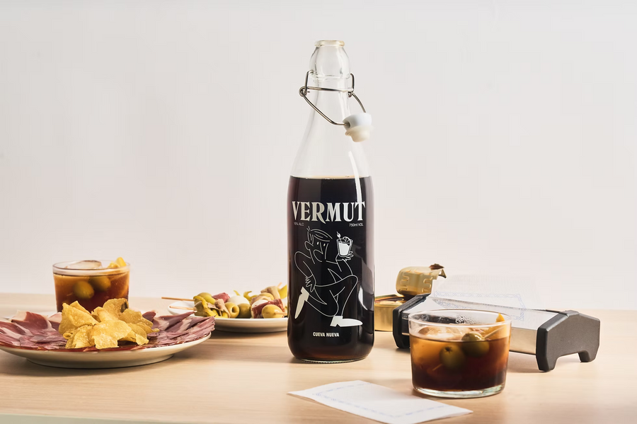 Cueva Nueva Vermut Rojo is a nod to the neighborhood tabernas that celebrate the tradition of la hora del vermut. Where drinkers gather for a collective moment to slow down, indulge in salty snacks, and enjoy rounds of vermut.