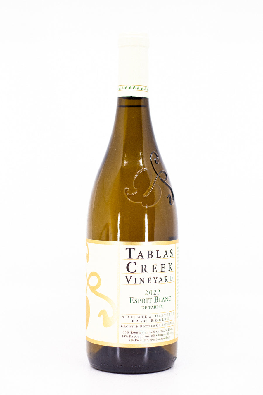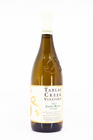 The Tablas Creek Vineyard 2022 Esprit de Tablas Blanc is our flagship white blend, chosen from the top lots of six white Rhone varieties propagated from budwood cuttings from the Château de Beaucastel estate. Roussanne provides the core richness, minerality, and flavors of honey and spice, while Grenache Blanc adds green apple and anise flavors, lush mouthfeel and bright acids. Picpoul Blanc adds pineapple brightness and saline minerality, Bourboulenc provides limestoney, citrusy lift, Clairette Blanche brings clean fruitiness and chalky minerality, and Picardan finishes with a little burst of acid, further emphasizing the mineral notes.